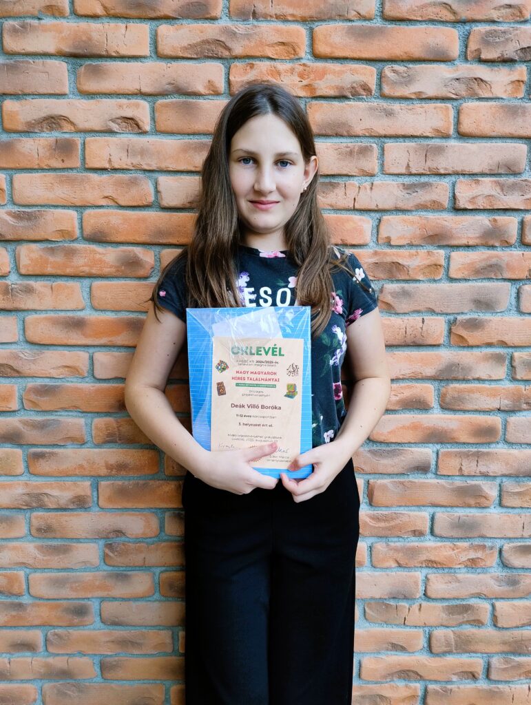 Gratulálunk iskolánk tanulójának, Deák Villő Borókának, aki a Hebe Kft. által szervezett „A nagy magyarok híres találmányai” című országos projektversenyen 3. helyezést ért el. Büszkék vagyunk a szép eredményre, és további sikereket kívánunk neki!