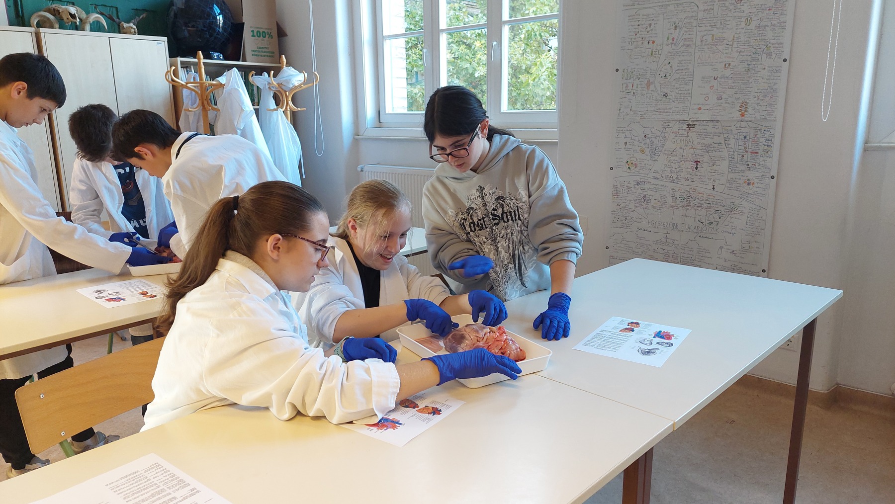 Egy érdekes témával, a szív működésével kezdtünk. A diákok maguk nézhettek a szív mélyébe, azaz boncolással tárhatták fel a sertésszív szöveteit, betekintve a pitvarok, a  kamrák és a billentyűk világába. Igazán izgalmas volt. Nagyon jó érzés volt az is,  hogy a gimnazista segítők között ott volt 6 lelkes egykori diákunk, akik a Refi biológia-kémia tagozatán folytatták tanulmányaikat.